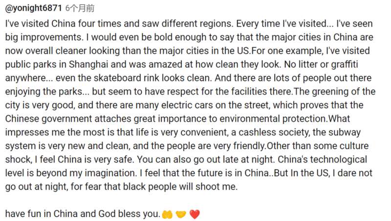 有来过上海的美国人说,上海的公园非常干净,没有垃圾和涂鸦,连滑板场看起来都很干净,城市里有很多电动汽车,整个城市非常方便,已经是无现金社会,同时很安全,在美国他晚上不太敢出门,因为怕黑人持枪枪击他.....