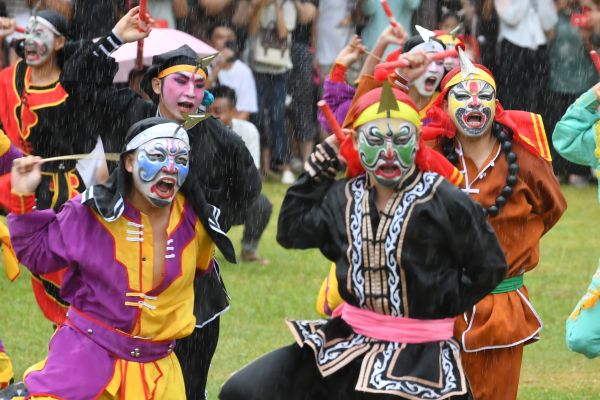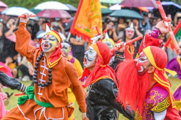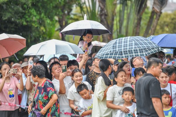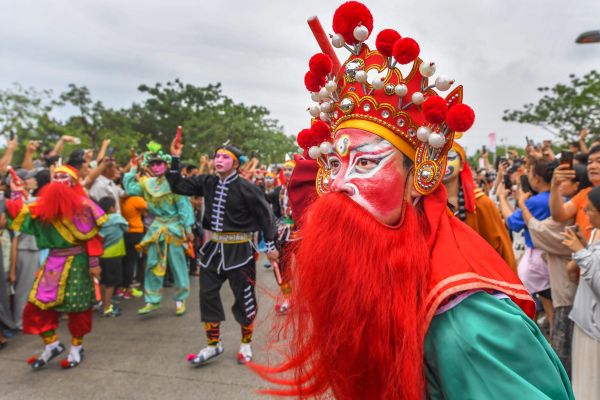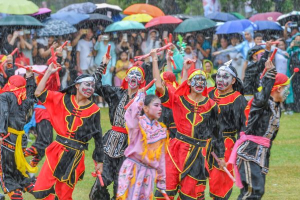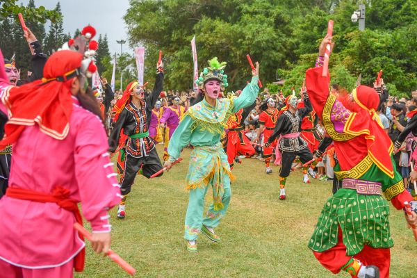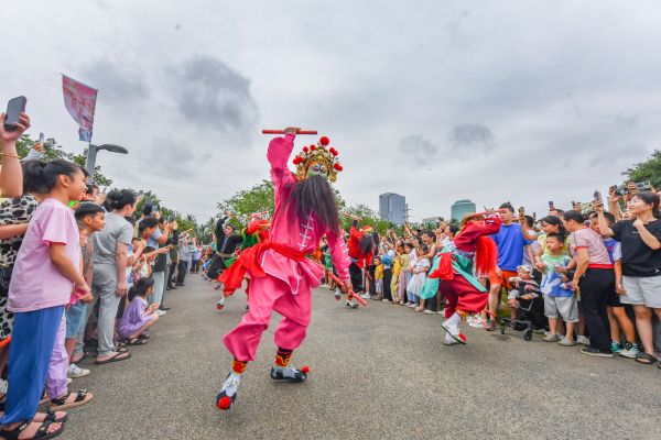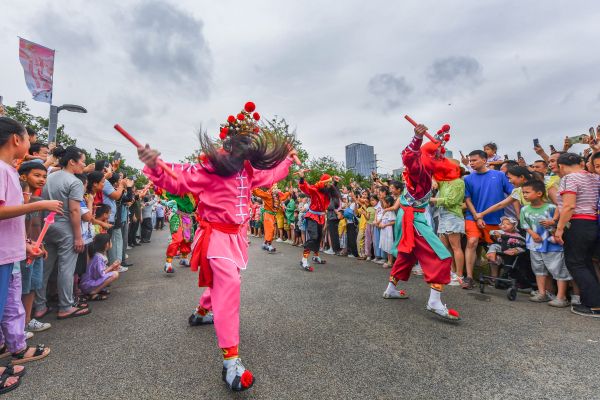 2024年5月1日,海南海口,万绿园,由龙华区人民政府主办的《龙行龘龘》琼粤非遗文化交流展演活动盛大举办。“咚咚嚓,咚咚嚓……” 来自潮汕的南山英歌队登场,强烈的鼓槌节奏汇聚成激越的力势,粗犷多变的步伐、独特的妆容服饰让观众目不暇接,现场掌声接连不断、此起彼伏。