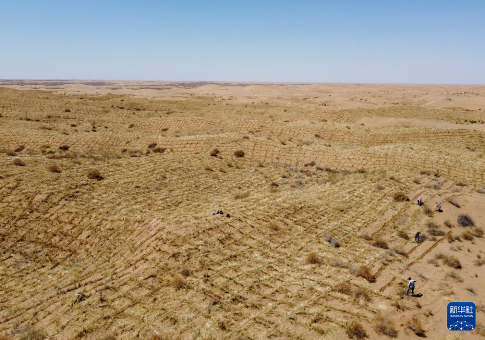 此时正是当地进行“草方格压沙”作业的好时节,几位林场职工在辛勤劳作。