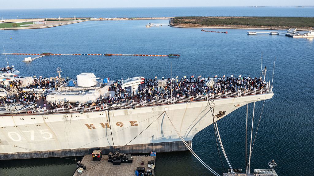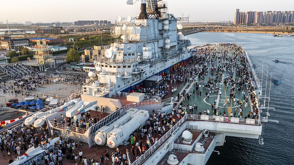 2024年5月2日,天津,我国第三艘航空母舰福建舰5月1日进行首次海试,不少“军迷”利用假期来到天津泰达航母主题公园,一览航空母舰的磅礴气势,游客在基辅号航母上参观游览。