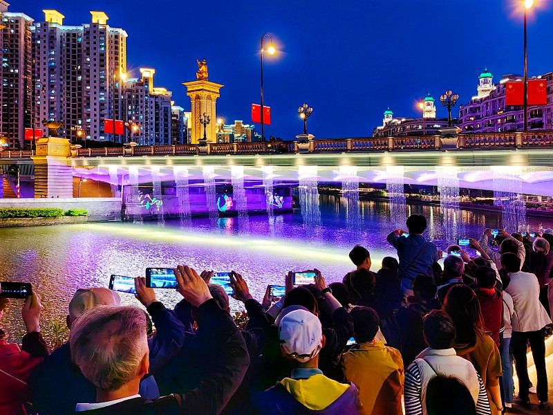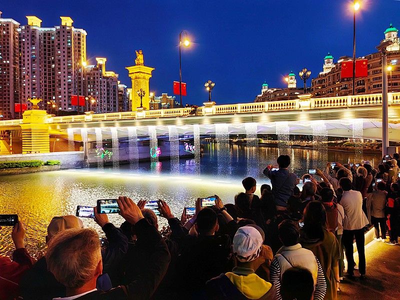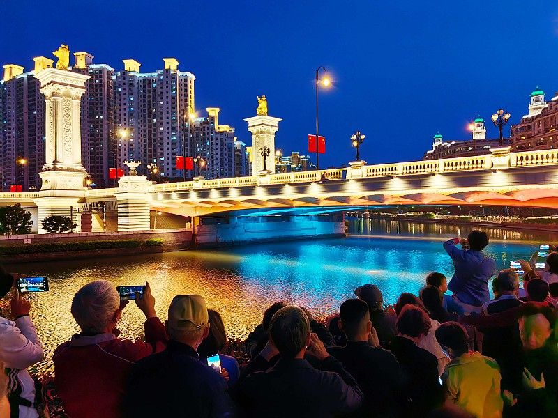 5月1日,上海,苏州河武宁路桥上演灯光秀。在历经6个月的精心改造提升后,始建于1956年的武宁路桥以全新面貌展现在市民面前,并于5月1日起每天18:30-20:30上演灯光水幕秀。