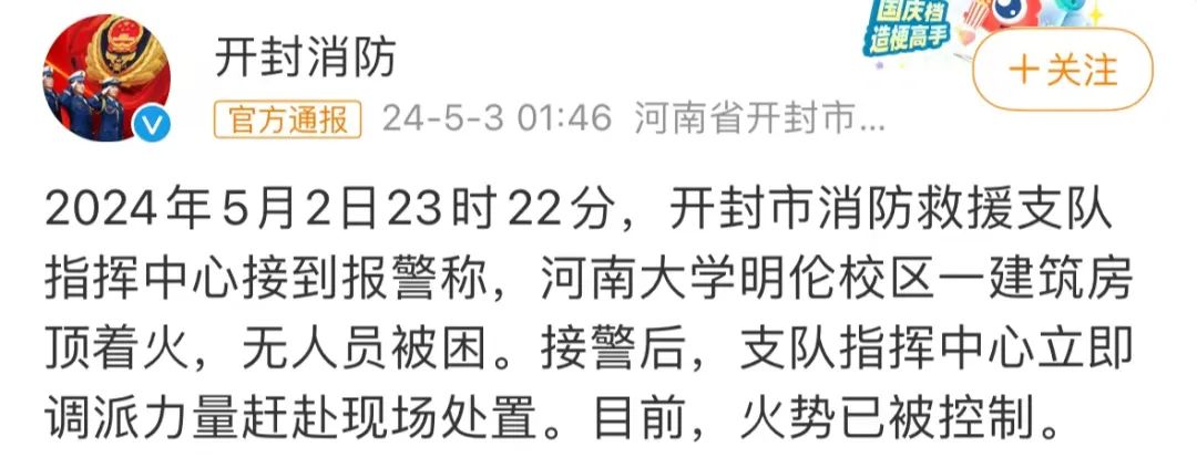 5月3日1时46分,开封消防发布官方通报称:“2024年5月2日23时22分,开封市消防救援支队指挥中心接到报警称,河南大学明伦校区一建筑房顶着火,无人员被困。接警后,支队指挥中心立即调派力量赶赴现场处置。目前,火势已被控制。”