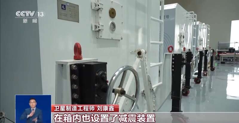 卫星制造工程师 刘康鑫:这种不是普通的集装箱,而是采用高强度轻量化的复合材料制造而成,箱内也设置了减震装置,保证卫星整个过程中受到的震动幅度是在我们要求范围之内的。