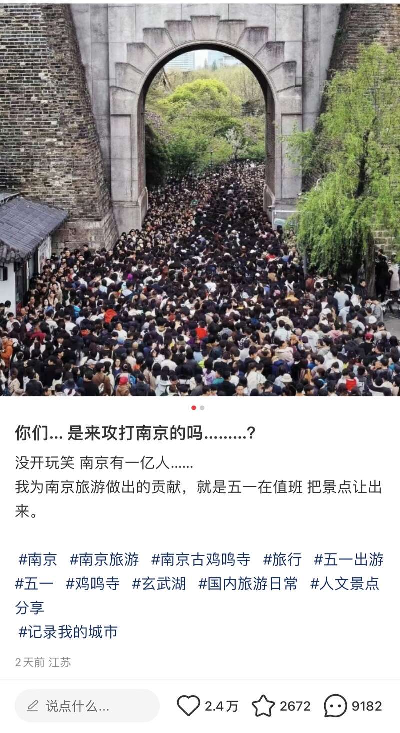某定位显示南京的网友表示:“我为南京旅游作出的贡献,就是五一在值班,把景点让出来。”