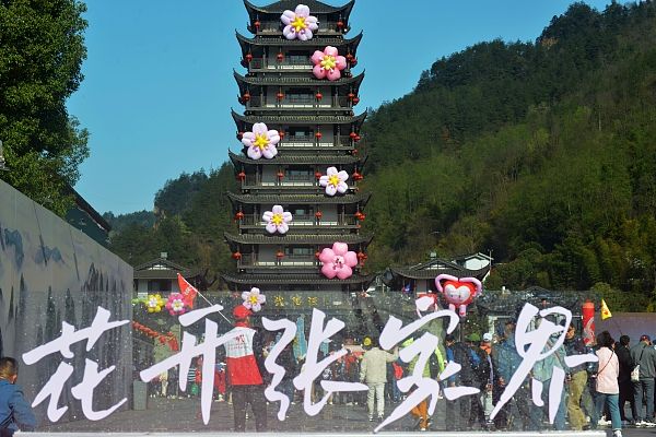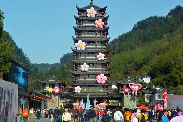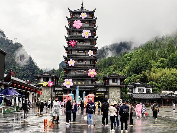 2024年5月4日,湖南省张家界市,张家界武陵源景区(张家界国家森林公园)东门广场,不少游客在“开花”的仿古建筑前拍照留影。