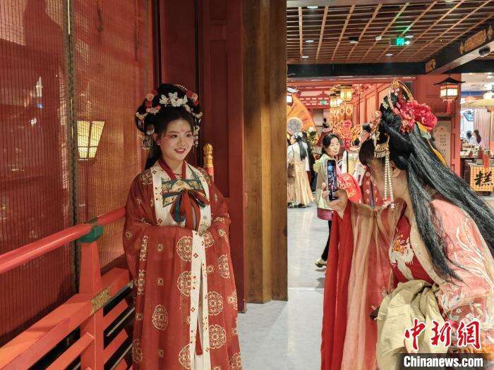 身穿一身华丽的唐朝仕女服饰,坐在西安大唐不夜城附近的咖啡店里,上海游客李欣欣很惊喜地发现,这种搭配并不突兀。“我不得不感叹,西安这些年对于传统文化的保护和推广很成功,不仅是在景区里,在城市的各个角落都有穿着汉服的身影。”