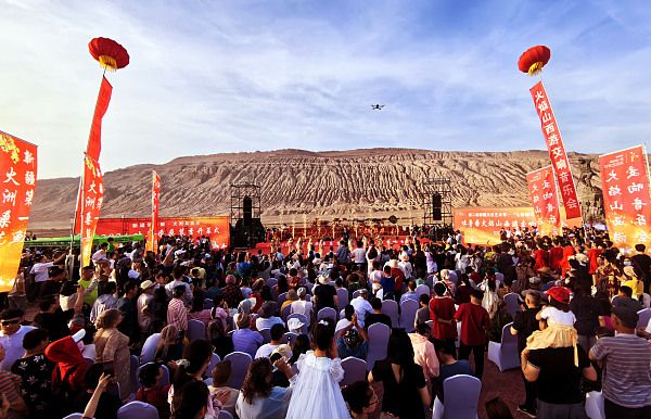 2024年5月4日,新疆吐鲁番,游客在火焰山下欣赏交响音乐会。当日,2024吐鲁番桑葚季开幕式暨火焰山西游交响音乐会在火焰山景区举行,吸引了众多游客观看。吐鲁番桑葚季活动以特色歌舞表演、吃桑葚比赛、品味美食、音乐会等精彩活动为载体,推动文旅活动与消费业态深度融合。