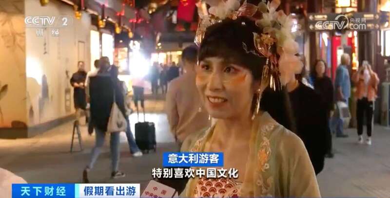 意大利游客:我特别喜欢中国文化,所以来体验一下。今天特意选了一套和“鱼”有关的衣服,因为我是双鱼座。而且在中文里,“年年有余”有很好的寓意。