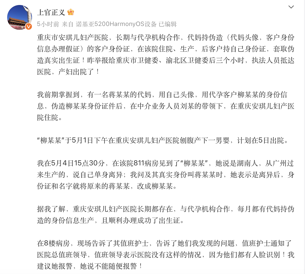 上官正义称,他前期掌握到,有一名蒋某某的“代妈”,用自己头像以及代孕客户柳某某的身份信息,伪造柳某某身份证件后,在中介业务人员刘某的带领下,在重庆安琪儿妇产医院住院。假的“柳某某”,也就是“代妈”于5月1日下午在重庆安琪儿妇产医院剖腹产下一位男婴,计划在5日出院。