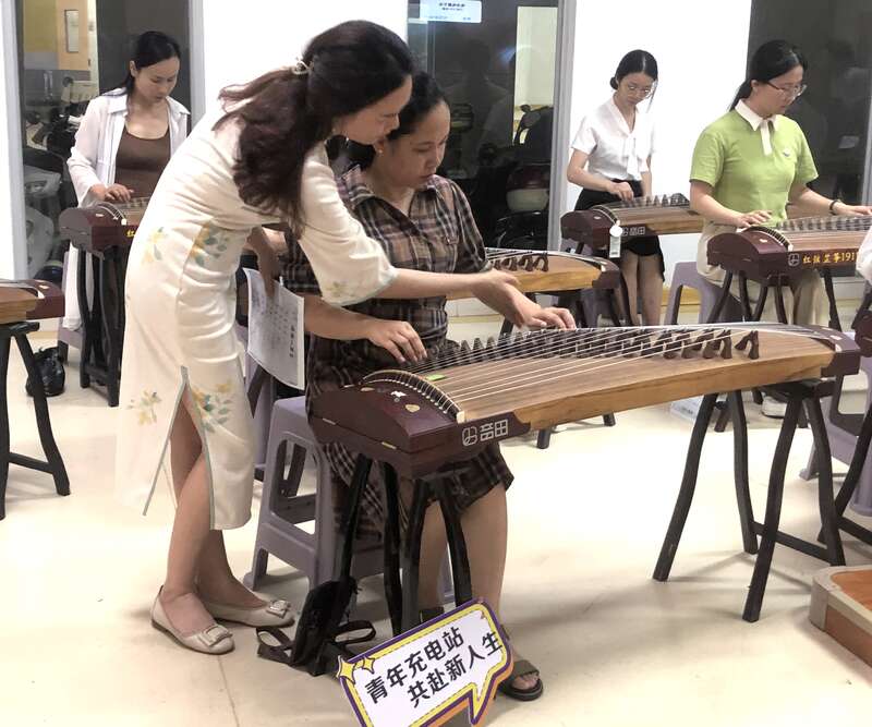 4月29日晚,南宁青年在南宁市青少年活动中心五象分部体验“韵美琴坊”古筝课堂。主办方供图