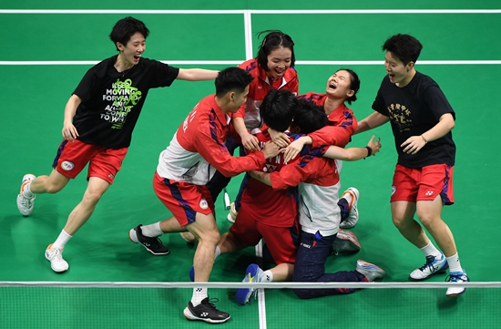 随着中国男双组合何济霆/任翔宇以2∶0战胜印尼选手菲克里/毛拉纳,成都高新体育中心全场沸腾。中国羽毛球男队最终以3∶1击败印尼队,夺得第33届汤姆斯杯冠军。