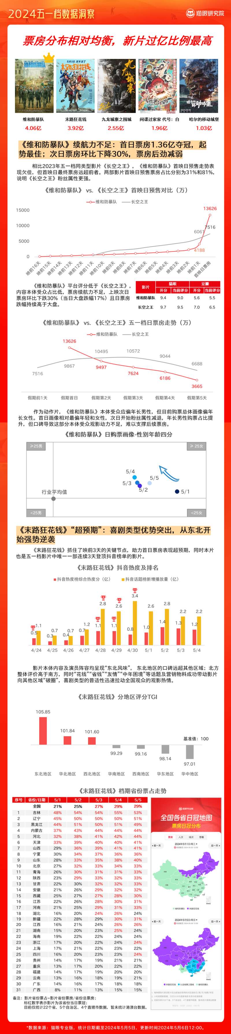 中国青年报客户端讯(中青报·中青网记者 蒋肖斌)2024年“五一”档落下帷幕,国家电影局5月6日发布数据,“五一”档电影票房达15.27亿元。猫眼研究院发布《2024五一档数据洞察》(以下简称《报告》)显示,今年“五一”档总票房同比去年增长0.4%,进入影史前三;5天日均票房3.05亿元,超去年同期。