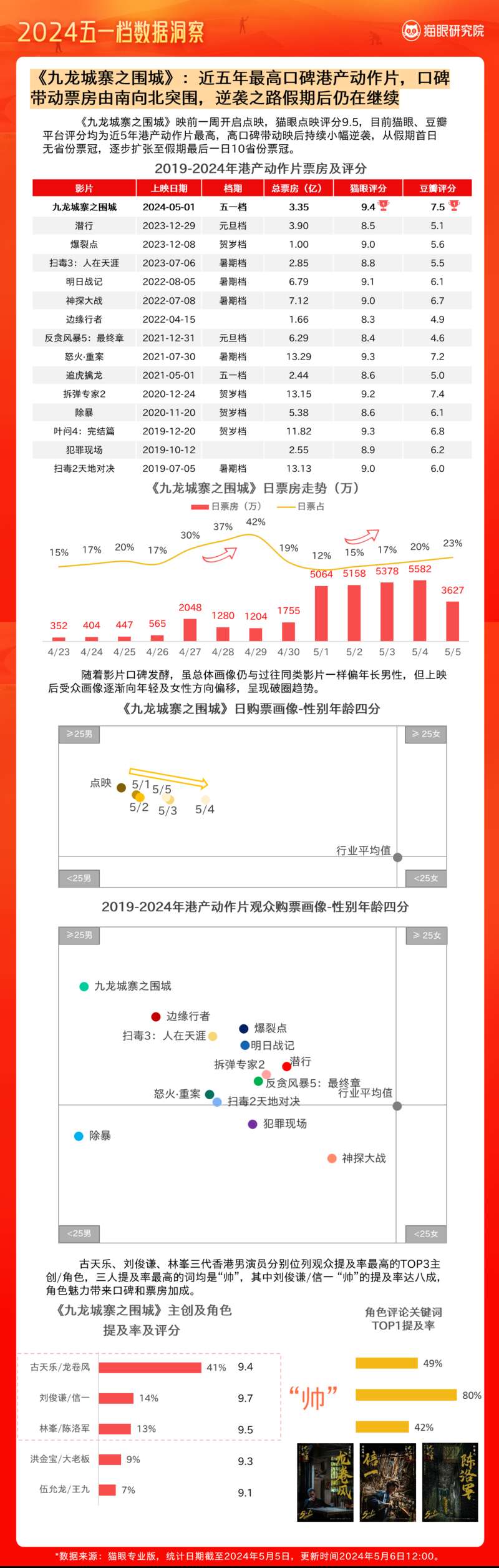 在影片内容上,电影类型、口碑等因素,对观影受众及票房影响更深。《报告》显示,“五一”档期内,票房排名前5名的电影分别为《维和防暴队》《末路狂花钱》《九龙城寨之围城》《间谍过家家 代号:白》和《哈尔的移动城堡》。