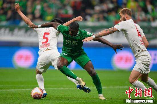5月5日,在北京举行的2024赛季中国足球协会超级联赛第10轮比赛中,北京国安队在主场对阵成都蓉城队。图为北京国安队球员法比奥·阿布雷乌(中)在比赛中拼抢。