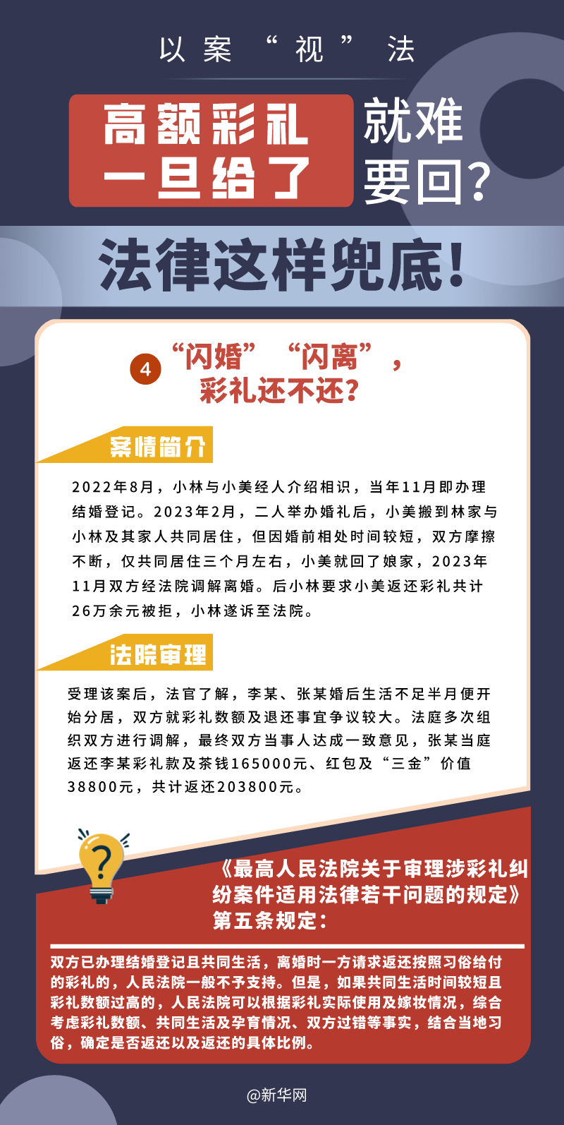 “五一”长假期间,各地迎来了婚礼高峰期,“彩礼”话题,尤其农村高额彩礼现象备受关注。破解高价彩礼,在解决争议的层面,司法尽了最大努力兜底。本期《以案“视”法》针对涉“高额彩礼”纠纷,带大家学习相关法律知识。