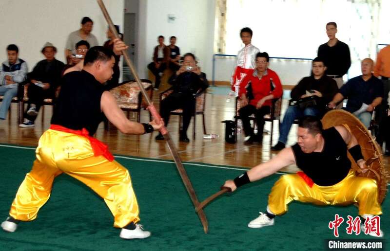 2006年4月,漳州民间武术师在福建漳州为参加“海峡两岸中华武术论坛”的台湾武艺文化研究协会、台湾体育运动史学会等专家学者演练精彩的武术项目。刘可耕 摄