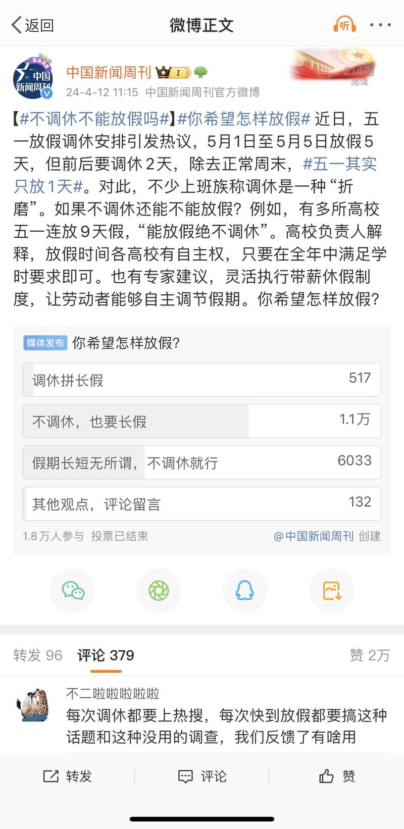在中国新闻周刊官方微博4月12日发起的“你希望怎样放假?”的投票中,“不调休,也要长假”的选项票数最多,为1.1万票。