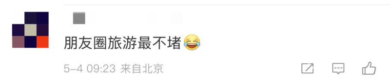 “五一”假期未出门的网友则表示:“朋友圈旅游最不堵。”