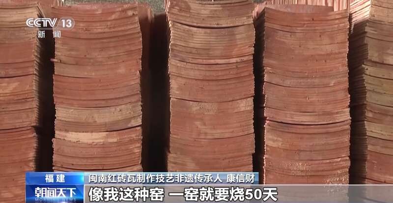 闽南红砖瓦制作技艺非遗传承人 康信财:我们都是保留传统制作工艺,最重要的一道是烧窑,小火从70℃烧到400℃要35天,400℃到600℃要耗费5天时间,这是中火。后面的大火从600℃加热到1000℃需要10天耗时,像我这种窑,一窑就要烧50天。