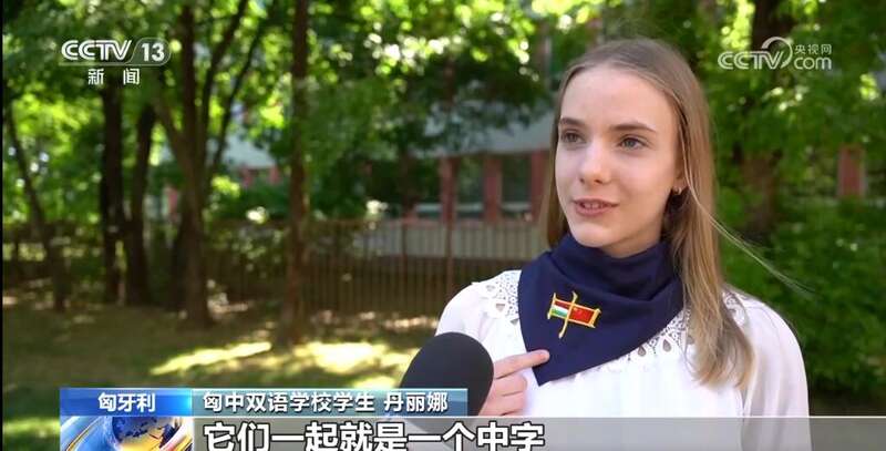 匈中双语学校学生丹丽娜说:“我很开心可以见到他们。我说,您好,我是匈中双语学校的丹丽娜,欢迎来到匈牙利。这个领带上可以看到匈牙利国旗和中国国旗,它们一起就是一个中字,这领带代表两个国家的友谊。我学了10年汉语,将来这个语言会给我打开很多工作的新门。”