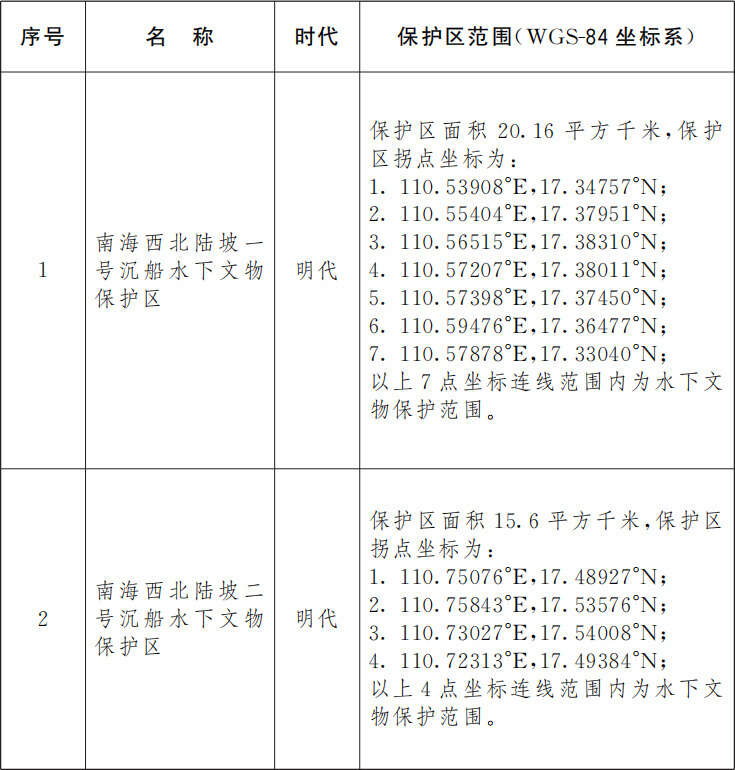 南海西北陆坡一号、二号沉船水下文物保护区名单