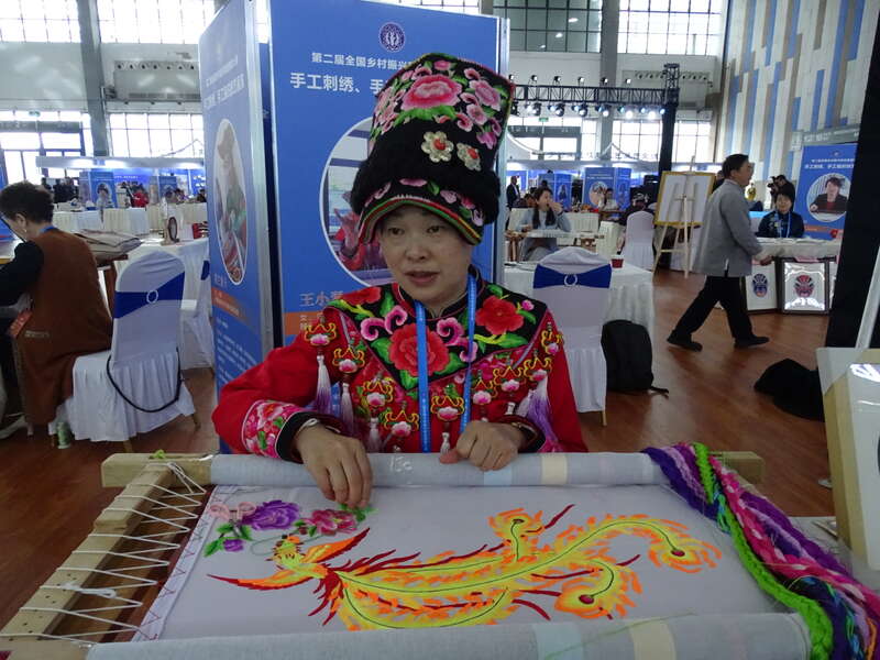 乡村工匠技能技艺展示区,一位苗族非遗传承人正在展示苗绣。中青报·中青网记者 李桂杰/摄