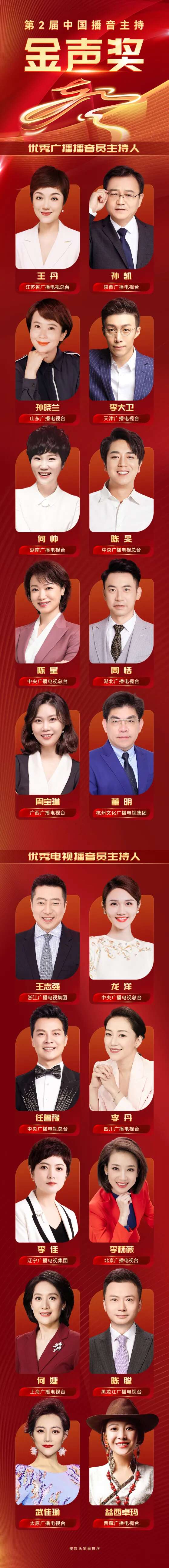 中国播音主持“金声奖”于2021年经中央批准设立,由国家广播电视总局主办、中国电视艺术委员会承办,是我国播音主持领域的国家级政府奖。本届“金声奖”共评选出20位获奖者,其中优秀广播播音员主持人10名,优秀电视播音员主持人10名。