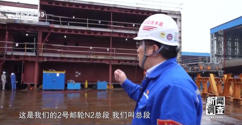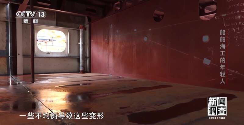 上海外高桥造船有限公司精度技术部副部长 孙建志:这个总段是典型的薄板结构,不平程度在正负15毫米之内。所有的变形都是热的影响,热输入以后就会产生残余应力,一些不均衡导致这些变形。尤其是薄板结构更明显,现在2号船的整体的平整度应该相对1号船已经好很多了。