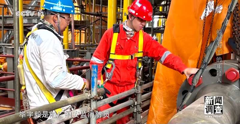 启东中远海运海洋工程有限公司安监消防员 毕宇毅:那个船非常漂亮,也是我进入这个行业第一个学习的项目,在一个300多米的船上,每天能走两万步。等到项目交付的那一刻,等这个船崭新摆在码头的时候,大家都感觉非常自豪。那一刻你也不知道看的是什么,可能看的就是过去两年半的青春奉献在了这个大国重器上面。