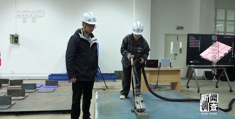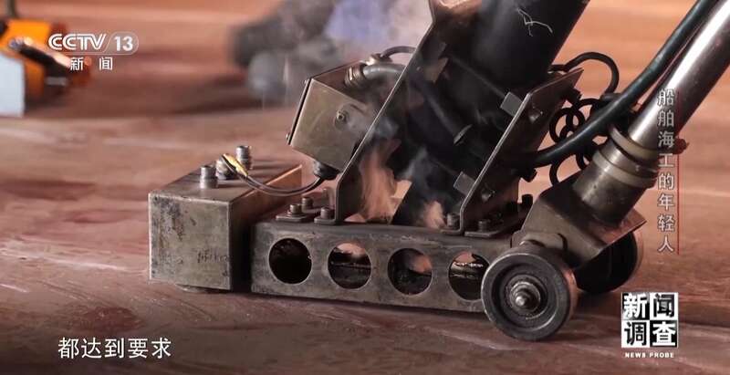 江苏大洋海洋装备有限公司技能大师工作室主任孙玉龙:这个板子比较特殊,它是EH690钢,硬度比较高,板厚也比较厚。想把它焊合格是很难的,两个人要焊一天。焊不好它会产生内部缺陷,比如说气孔、裂纹等一系列的缺陷在里面。