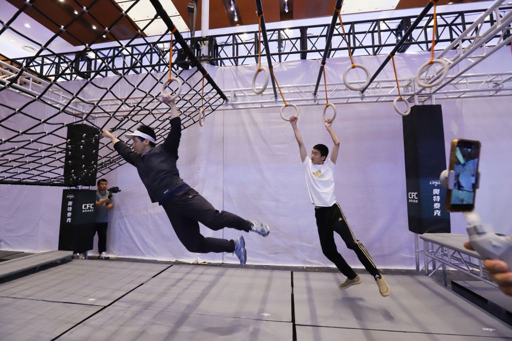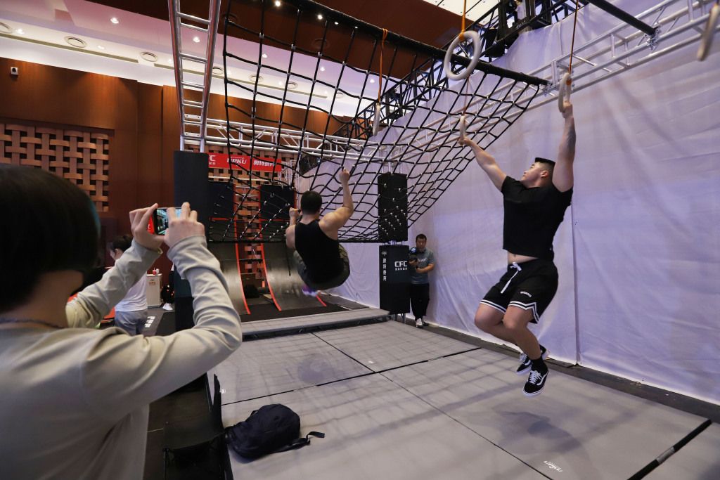 2024年5月11日,观众在第12届CHINAFIT北京体育与健身大会上体验一款体能测试健身器材。