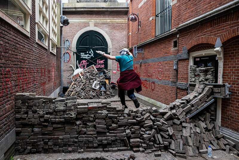 在荷兰阿姆斯特丹大学,数百名抗议者在校园周围示威。警察用警棍驱赶人群,撕碎了学生搭建的帐篷。