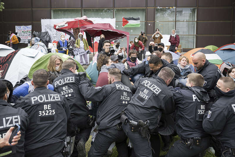 美国警方对示威采取了行动。据美国《纽约时报》报道,美国警察和大学管理人员在数十所大学与抗议者发生冲突。学生们被捕,营地被拆除,警方联合校方以“学术后果”相威胁……截至5月13日,已有超过2800人在全美各地的校园里被捕。