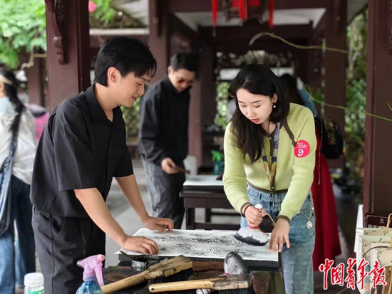 活动中安排的碑拓体验让参与者感到既新鲜又长见识。“用宣纸和墨汁,将刻在石碑上的三苏诗句转印到纸上,这一过程看起来简单,其实做起来并不容易。”邹袁媛说。