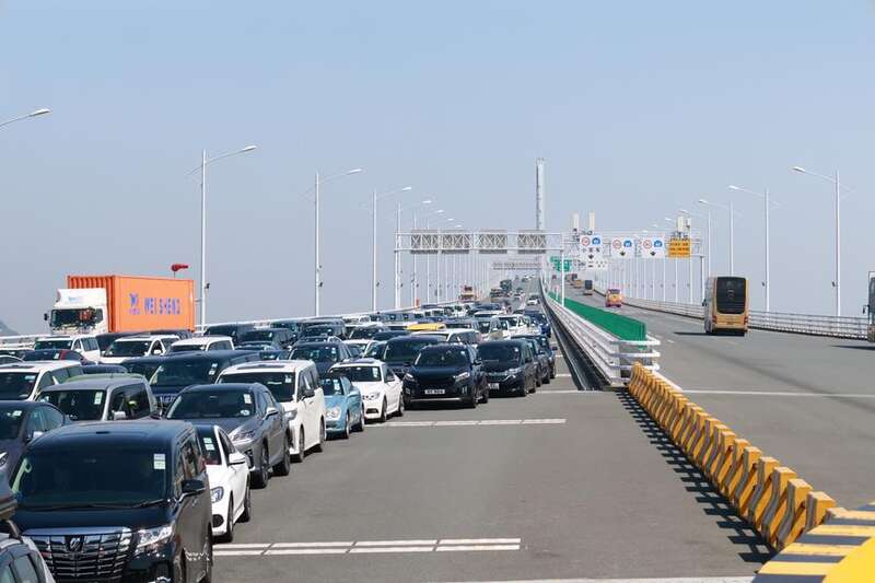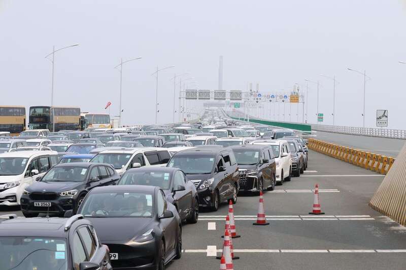 2024年4月6日在港珠澳大桥桥头拍摄的等待入境的车辆。 新华社发(王相国 摄)