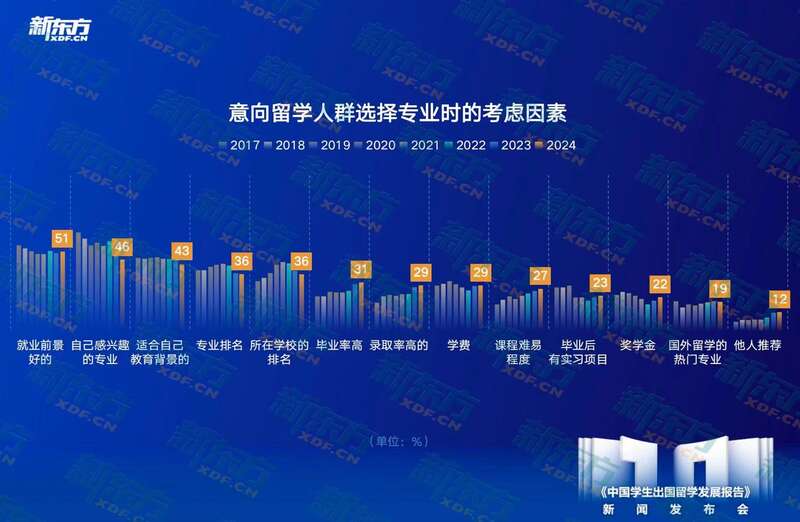 对就业的关注也体现在专业选择上。《报告》显示,意向留学人群的专业选择越来越受就业市场的影响。在留学市场逐渐放开后,就业前景的重要性回升,兴趣和与自身教育背景适配度的重要性呈下滑趋势,不再是选择留学专业的决定性因素。