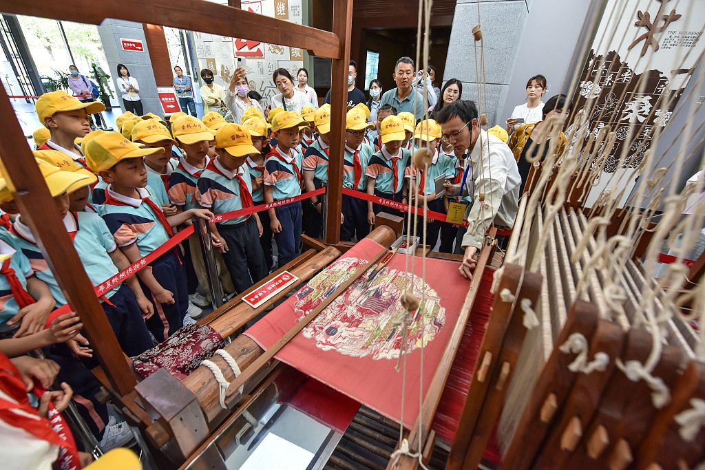 2024年5月16日,在安徽京九丝绸股份公司华夏丝绸博物馆,安徽省阜阳市苗桥小学的学生在参观大花楼织机。当日,安徽省阜阳市苗桥小学组织学生,来到安徽京九丝绸股份公司开展以“劳动创造幸福”为主题的实践活动。通过参观丝绸博物馆、丝绸生产车间、观看科普视频《蚕的故事》、领养“蚕宝宝”等,了解具有地方特色的养蚕及纺织文化,感受劳动带来的快乐和蚕桑文化的独特魅力。