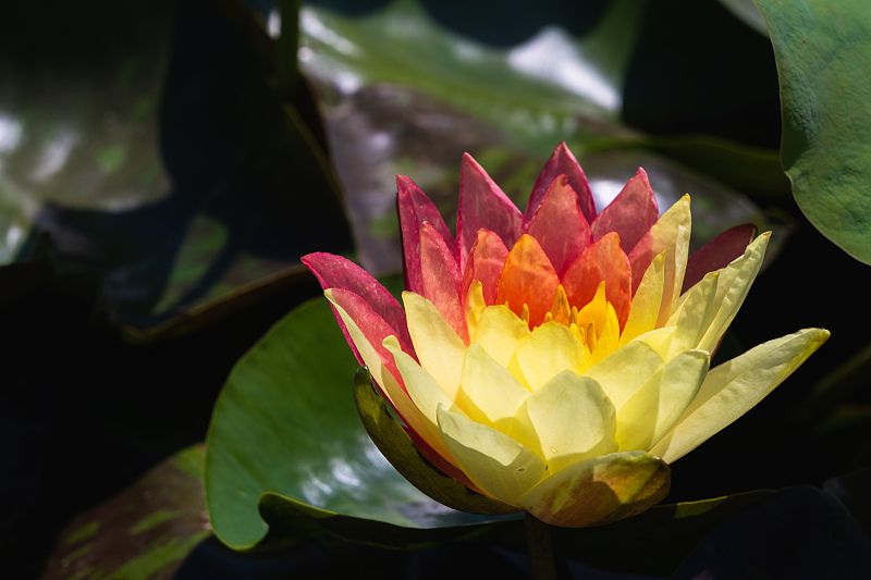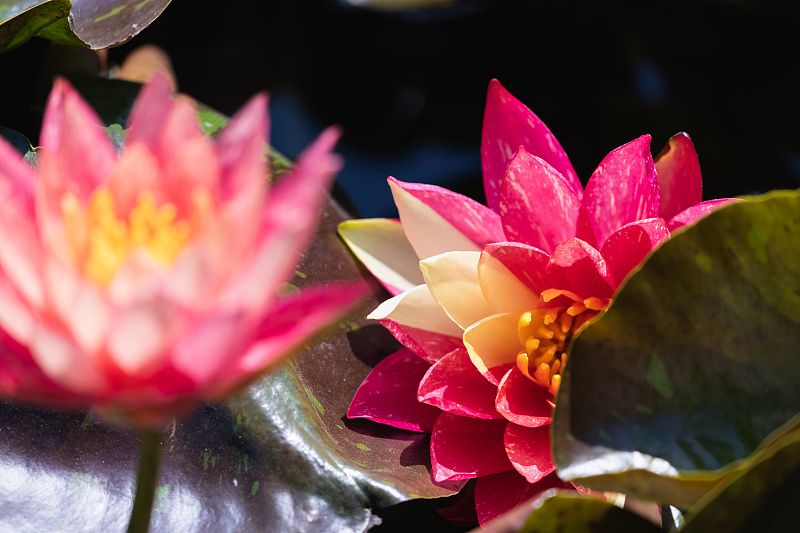 2024年5月17日,杭州,湘湖景区湘湖花海十里荷塘中的睡莲已经绽放,其中有一半红一半黄的“鸳鸯莲”双色睡莲。