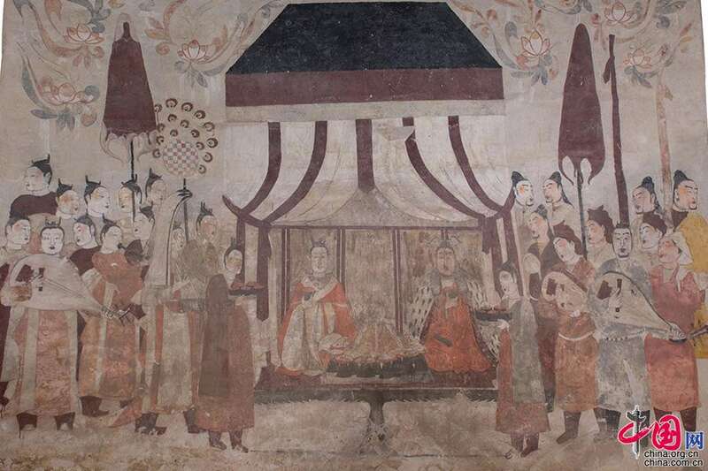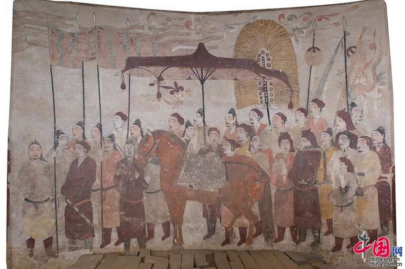 在徐显秀墓壁画中描绘的仪仗队伍,既有鲜卑人、也有汉族人物,他们共同存在于一个画面中,并没有明显的社会地位的区分。在《宴饮图》中身着华服的墓主人夫妇端坐在帷帐下的榻上,在演奏乐队中有乐师头戴鲜卑帽、身穿窄袖长袍,这些都说明了当时胡汉之间的交融和开放包容的社会风气。朔州水泉梁墓壁画中也有胡人的形象,在墓主人出行的车马队中,就有高鼻深眼、胡须浓密的胡人驭手。壁画中,有“胡床”这类展现胡汉杂糅交融的符号、元素,也有西域人士在此经商、交流的场景,这些鲜活的例证共同讲述了中华民族多元一体融合发展的故事,展现了农耕文化、游牧文化多元融合的演进过程。