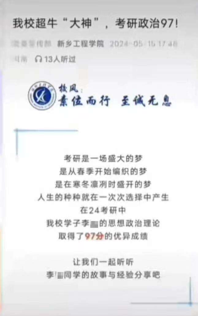 5月15日,新乡工程学院公众号发布的一则“我校超牛大神,考研政治97分”的帖子引网友热议。不少网友质疑政治考97分太过离谱,又不是理科,即使选择题满分,主观题仅扣3分也不太可能,怀疑成绩截图是P图伪造。有网友分析表示,正常考研成绩截图中总分三位数均与专业代码的三位数对齐,但该考生的成绩373分并未与下方的专业数字代码对齐。