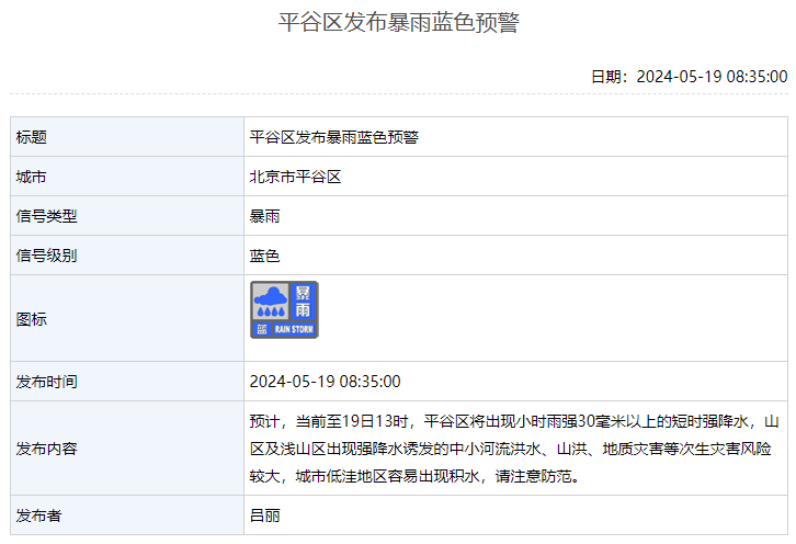 据北京市气象局消息,5月19日8:35,平谷区发布暴雨蓝色预警:预计,当前至19日13时,平谷区将出现小时雨强30毫米以上的短时强降水,山区及浅山区出现强降水诱发的中小河流洪水、山洪、地质灾害等次生灾害风险较大,城市低洼地区容易出现积水,请注意防范。