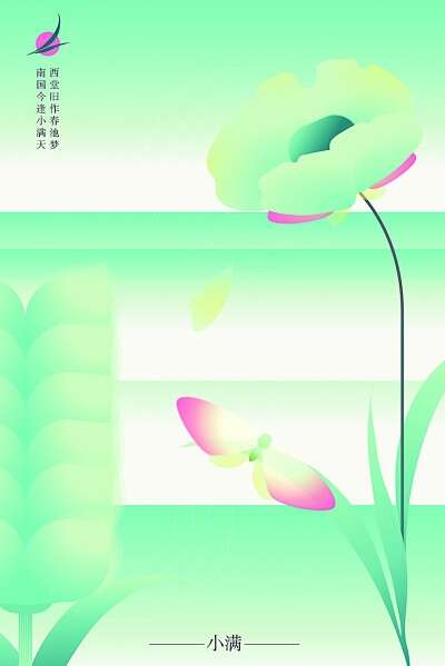 初夏时节,虞美人花姿态优美、色彩绚丽,随风摇曳似彩云朵朵。作品①主体选取了小满的节气花虞美人,背景用抽象线条表达垄头麦穗初齐的景观,在颜色上采取具有夏日感的鹅黄和青绿,以区别于秋天金黄色的“大满”,意味着夏满带来的虽不是秋天的累累收获,却是满怀希望的期待。