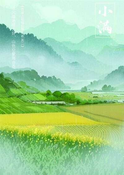 小满时节,麦粒渐满。小麦自然成为小满主题海报中最热门的设计要素。作品②的设计灵感来源于欧阳修的诗句《五绝·小满》,百花渐落,落红成陈,唯有麦苗茁壮成长,未成熟但已灌浆饱满的麦子于风中微摆,组成一张生机盎然的日历海报。作品③选取了有麦田和油菜花田的田园风光,以偏向自然的黄色和绿色搭配雾气升腾的山景,再增添一些雨水的质感,打造出小满时节柔和湿润的节气氛围。作品④则更为直观地展现了大片谷物迎风摇摆的景象,同时采用群山飞鸟作为后景,展现出农耕时代田园生活怡然自乐的惬意感。
