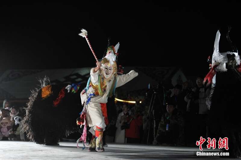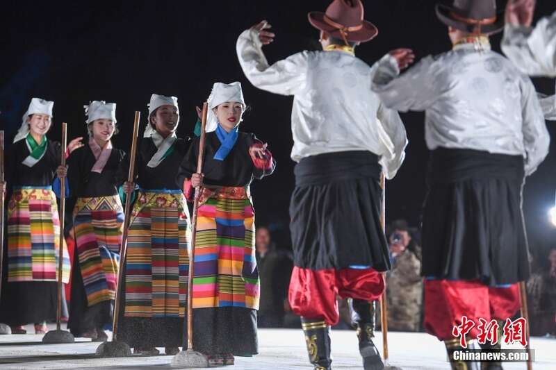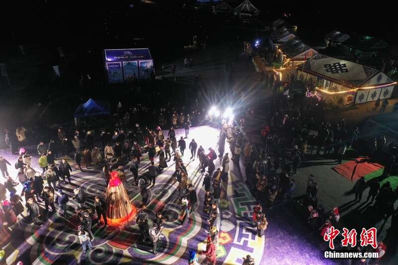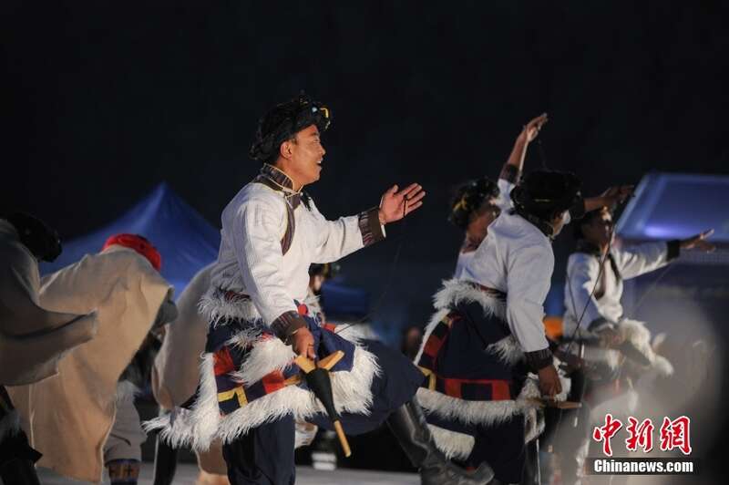 5月18日晚,西藏拉萨市当雄县纳木错湖畔,当地牧民带游客体验篝火锅庄舞。纳木错,被誉为“天湖”,吸引着大量游客前来观光。图为篝火锅庄舞晚会上的文艺演出。
