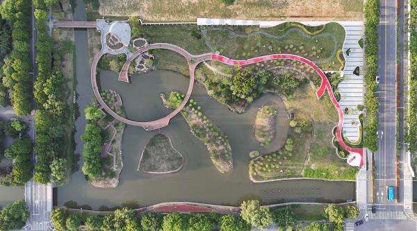 据介绍,从空中鸟瞰,公园的“爱心岛”与空中栈桥构成项链形状,尽显爱情浪漫;I岛、爱心岛与无人岛等互相衔接,从北向南看宛如中文“心”字,从南向北看呈现英文的“I ”“ ”“U”。公园的红色栈道将东南角的“爱心广场”和西北角的“夫妻百年”景点相连,寓意从热恋到白首的浪漫之路。东侧广场上,则种植着桃树、连理树、柿子树等象征爱情的树种,连成一条“爱情长廊”。在“恋人码头”,开设游船环线,连接“爱情湾”“亲子湾”和“青莲公园”3个不同风格的社区公园,让“爱情”“亲情”与“友情”相得益彰。
