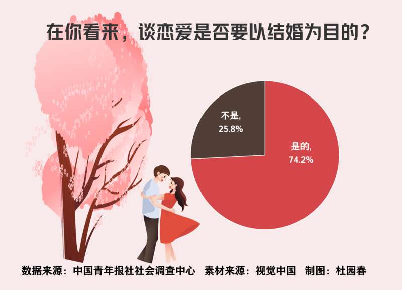 日前,中国青年报社社会调查中心联合问卷网(wenjuan.com),对1341名在校大学生进行的一项调查显示,74.2%的受访大学生都明确表示谈恋爱要以结婚为目的,且受访男生较受访女生更认同这一观点。