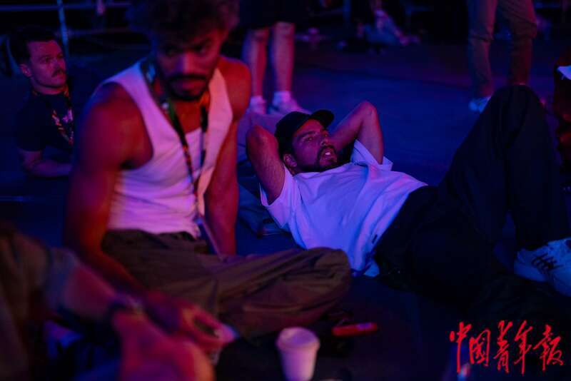 5月19日,上海,奥运资格系列赛·上海的霹雳舞决赛,选手们在舞台边的空地观看比赛。中青报·中青网记者 李隽辉/摄