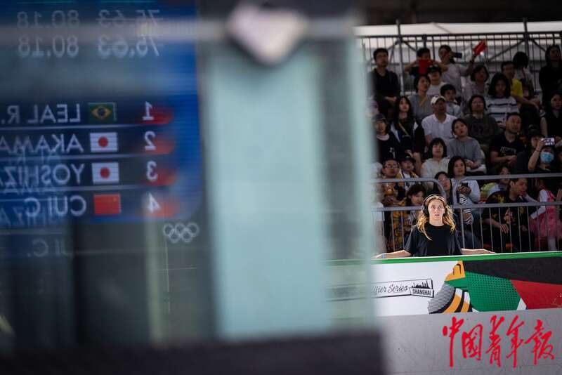 5月19日,上海,奥运资格系列赛·上海女子滑板街式决赛,美国选手P. PINSON在等待最终成绩。中青报·中青网记者 李隽辉/摄
