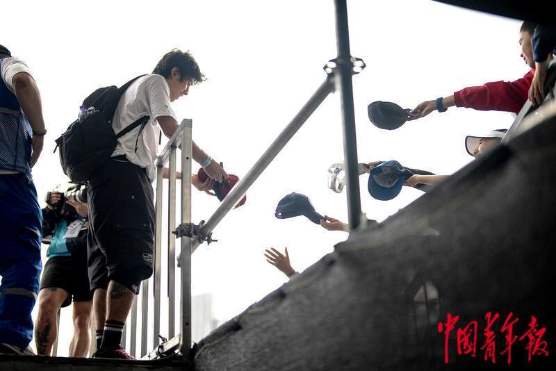 5月19日,上海,奥运资格系列赛·上海的男子滑板碗池决赛后,巴西选手L. CINI为观众们签名。中青报·中青网记者 李隽辉/摄