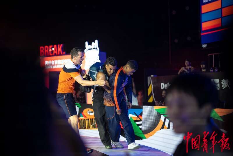 5月19日,上海,奥运资格系列赛·上海的霹雳舞男子组决赛,荷兰选手LEE(右一)胜出后庆祝。中青报·中青网记者 李隽辉/摄